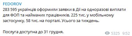 Об этом Михаил Федоров написал в своем Telegram-канале в понедельник, 21 декабря. "283 595 украинцев оформили заявки в Дии на единовременные выплаты для ФЛП и наемных работников. 225 тыс. в мобильном приложении, 58 тыс. на портале. Всего за неделю", - написал Федоров.