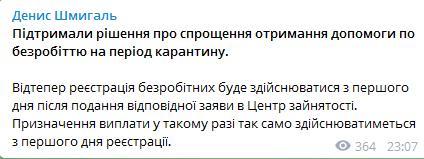 "Отныне регистрация безработных будет осуществляться с первого дня после подачи соответствующего заявления в Центр занятости. Назначение выплаты в таком случае так же будет осуществляться с первого дня регистрации", -сообщает Денис Шмыгаль в воскресенье, 29 марта.