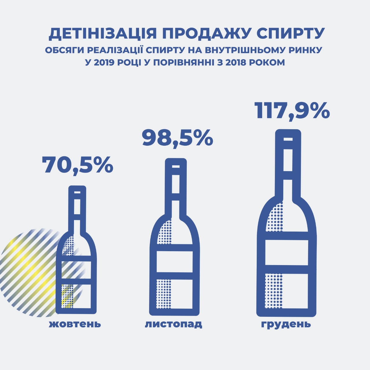 Об эффективности принятых мер свидетельствует значительное увеличение объемов реализации спирта на внутреннем рынке в течение 4 квартала 2019 года. Если в октябре прошлого года этот показатель составлял лишь 70,5% к соответствующему периоду 2018 года, в ноябре - уже 98,5%, то в декабре - 117,9%. Это свидетельствует о наличии положительной тенденции в сфере детенизации рынка спирта.