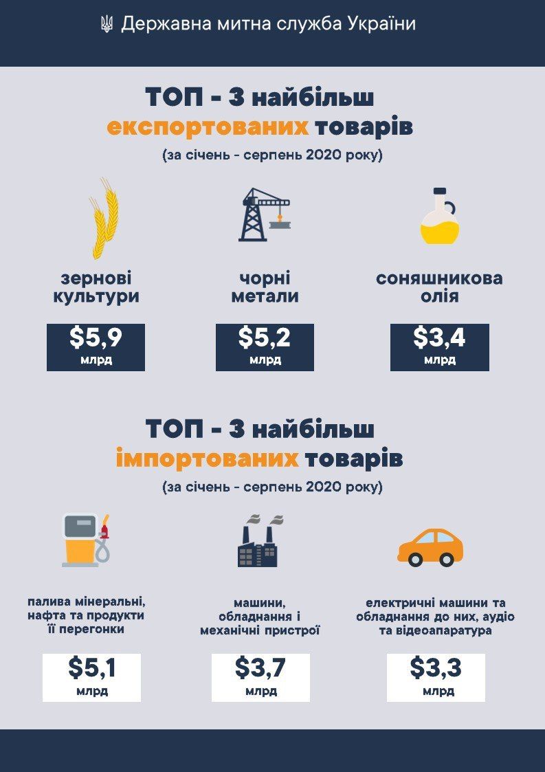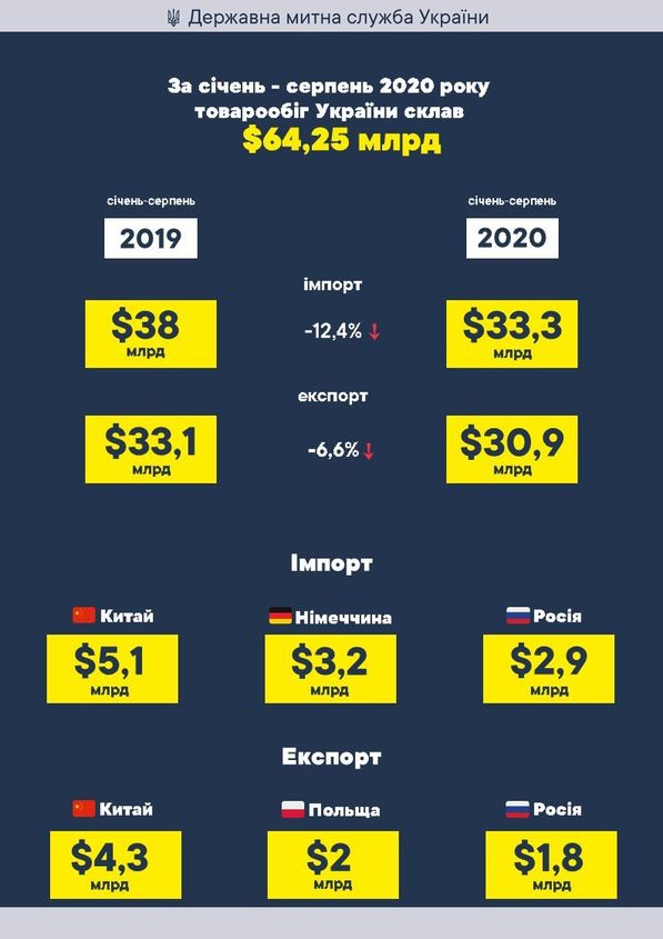 Государственная таможенная служба Украины сообщила, что за январь-август текущего года товарооборот Украины составил $64,25 миллиарда. В Украине импортировали товаров на более $33,3 миллиарда. По сравнению с аналогичным периодом 2019 года, импорт сократился на $4,7 миллиарда или на 12,4%. Экспорт из Украины составил $30,9 миллиардов, сокращение составляет $2,2 миллиарда или 6.6%.