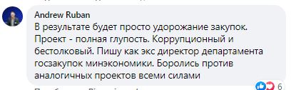 Противоположной точки зрения придерживается Андрей Рубан, бывший чиновник Министерства развития экономики, торговли и сельского хозяйства Украины. Он заявил, что законопроект "коррупционный", и его результатом станет просто удорожание закупок. "Будем закупать наше худшего качества дороже на 30%", - добавил он.