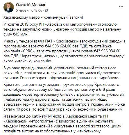 Алексей Мовчан, нардеп от "Слуги народа", заявил, что тендеры не учитывают последующие расходы покупателя на обслуживание и ремонт приобретенной техники. Так, отечественные вагоны метро пусть и стоят немного дороже, чем китайские, однако расходы на их содержание - в 6-8 раз меньше, а срок службы может достигать 40 лет. Поэтому, по мнению Мовчана, протекционизм несет экономическую выгоду в долгосрочном смысле.