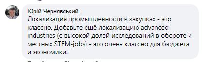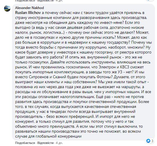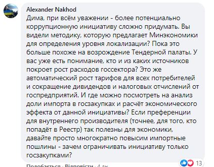 Бывший руководитель "Прозорро", а ныне - глава тендерного подразделения "Укрпочты" Александр Наход заявил в комментарии к посту Кисилевского, что "более коррупционную инициативу сложно придумать", принимая во внимание предлагаемую Минэкономики методику определения уровня локализации, а также затронул тему качества отечественной техники, которая далеко не всегда "на уровне".