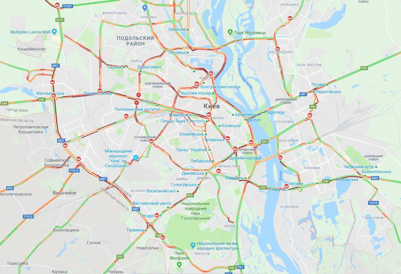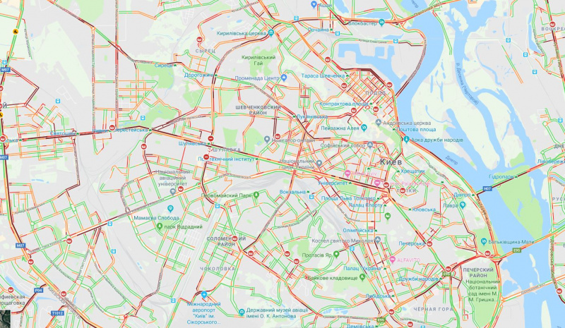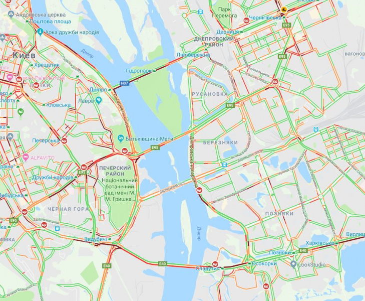 На правом берегу пробки образовались в центральной части столицы, на Набережном шоссе, Большой Кольцевой дороге, Голосеевском проспекте, проспекте Валерия Лобановского, бульваре Дружбы Народов, бульваре Леси Украинки, Воздухофлотском проспекте, проспекте Победы, ул. Вадима Гетьмана, ул. Елены Телиги, на Лукьяновке, проспекте Степана Бандеры, ул. Набережно-Луговой и ул. Набережно-Крещатицкой.