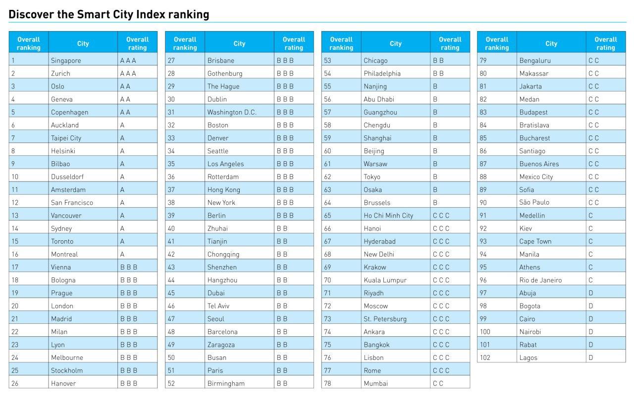Единственный в своем роде глобальный индекс IMD Smart City Index 2019 фокусируется на том, как граждане воспринимают масштабы и влияние усилий, направленных на то, чтобы сделать свои города "умными", уравновешивая "экономические и технологические аспекты" с "гуманными измерениями".