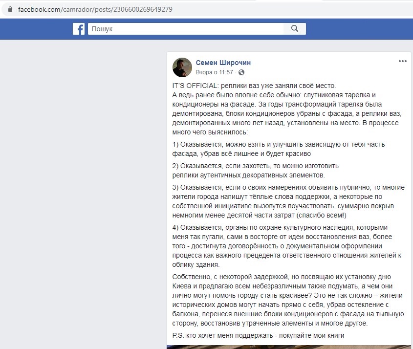 В Киеве историк советской архитектуры Семен Широчин вернул своему дому на Липской улице декоративные вазы, которые украшали его фасад с 1939 года. Фото фасада с обновленными вазами он обнародовал на своей странице в Facebook, накануне, посвятив их возврат Дню Киева.