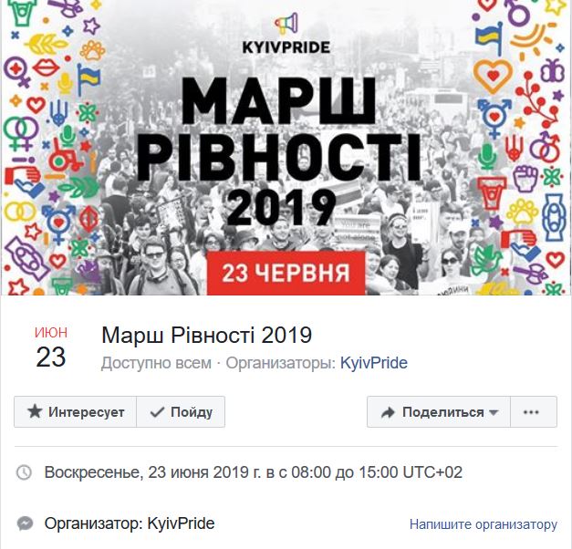 "23 июня, в воскресенье, в Киеве состоится Марш равенства (Киевпрайд 2019", - говорится в сообщении на странице Киевпрайд в Facebook.