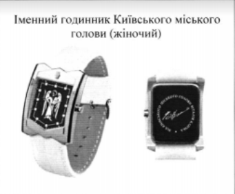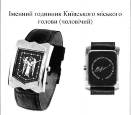 Аппарат Киевской горгосадминистрации закупил у ООО “Киевский часовой завод” 1500 именных часов Киевского городского главы от торговой марки Kleynod. Сумма сделки составила 3,69 млн гривен. По информации “КиевVласть”, 22 июня аппарат КГГА заключил договор на 3,69 млн гривен с ООО “Киевский часовой завод” на поставку часов. Подрядчик должен поставить 875 мужских и 625 женских именных часов, цена за единицу – 2,05 тыс. гривен. Сообщается, что 23 июня Государственная аудиторская служба начала мониторинг данной закупки из-за полученной информации о нарушениях.