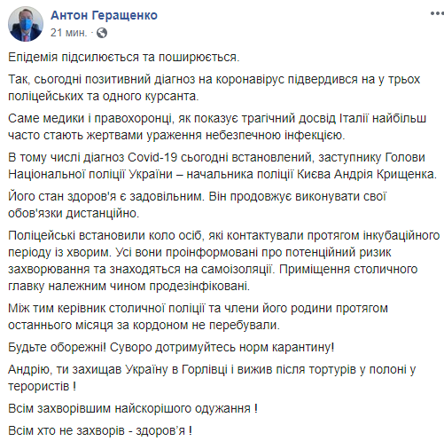 "Все они проинформированы о потенциальном риске заболевания и находятся на самоизоляции. Помещения столичного главка должным образом продезинфицированы. Между тем руководитель столичной полиции и члены его семьи в течение последнего месяца за границей не находились", - написал Геращенко.