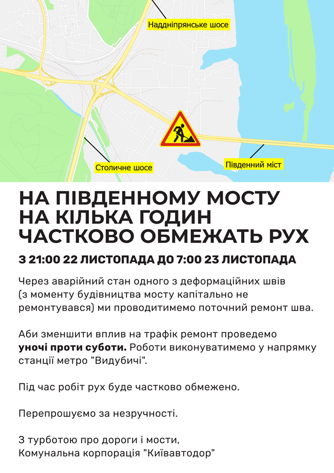 Сегодня, 22 ноября, вечером будет ограничено движение на Южном мосту в Киеве в связи с ремонтно-восстановительными работами.