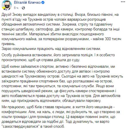 Мэр столицы Виталий Кличко сообщил, что вандал разбил установленную систему ограниченного доступа для автомобилей и контроля скорости на Трухановом острове. По словам градоначальника, злоумышленника задержала полиция.