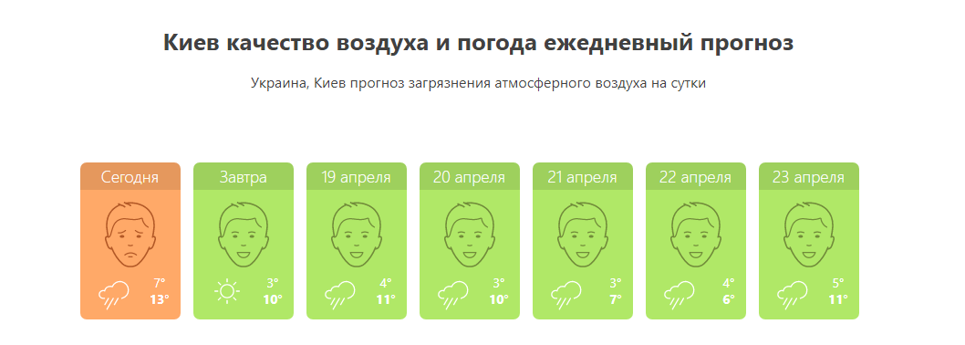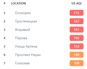 Вместе с тем сайт мониторинга качества воздуха IQAIR сообщает, что уровень загрязнения атмосферы в Киеве превышает норму почти в 3,5 раза. Однако есть предпосылки, что к 18 апреля воздух очистится. Об этом свидетельствует инфографика, опубликованная на сайте IQAIR. Также на сайте сообщается, что состоянием на 13.00 пятницы, 17 апреля, самый "тяжелый воздух" сейчас в районе улицы Тростянецкой, на втором месте по загрязнению — массив Осокорки, и на третьем — район улицы Артема.