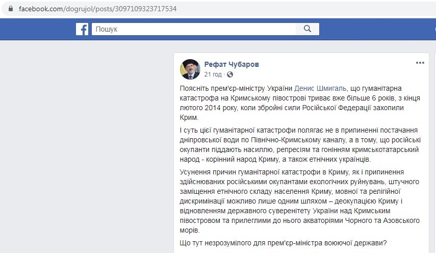 Глава Меджлиса крымскотатарского народа Рефат Чубаров отреагировал на слова премьер-министра Украины Дениса Шмыгаля о возможности возобновления поставок воды в аннексированный Крым в случае гуманитарной катастрофы. Чубаров заявил, что на полуострове эта катастрофа началась шесть лет назад, когда вооруженные силы России захватили Крым.