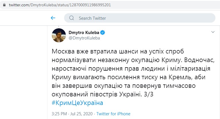 Россия упустила шанс нормализовать незаконную оккупацию Крыма. Об этом заявил министр иностранных дел Дмитрий Кулеба в Twitter в субботу, 25 июля.