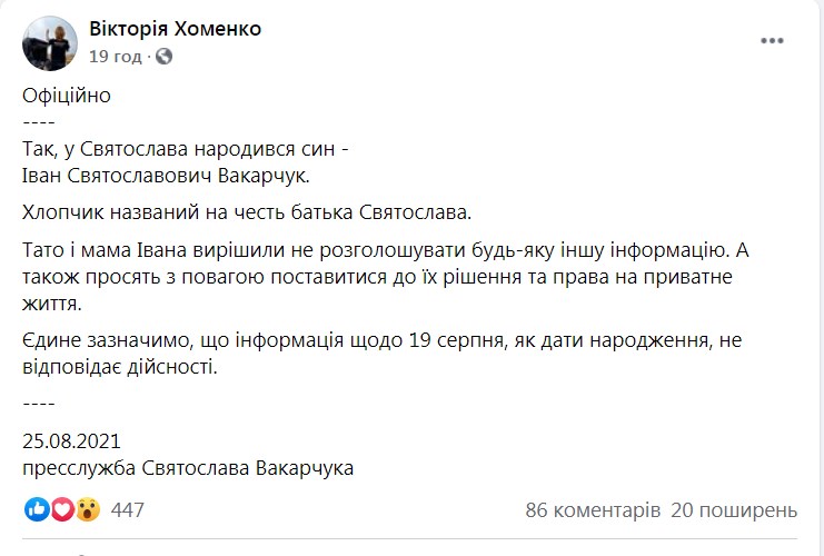 Мальчика назвали Иваном в честь отца Святослава Вакарчука. Об этом 26 августа сообщила в "Фейсбуке" менеджеру группы Виктории Хоменко.
