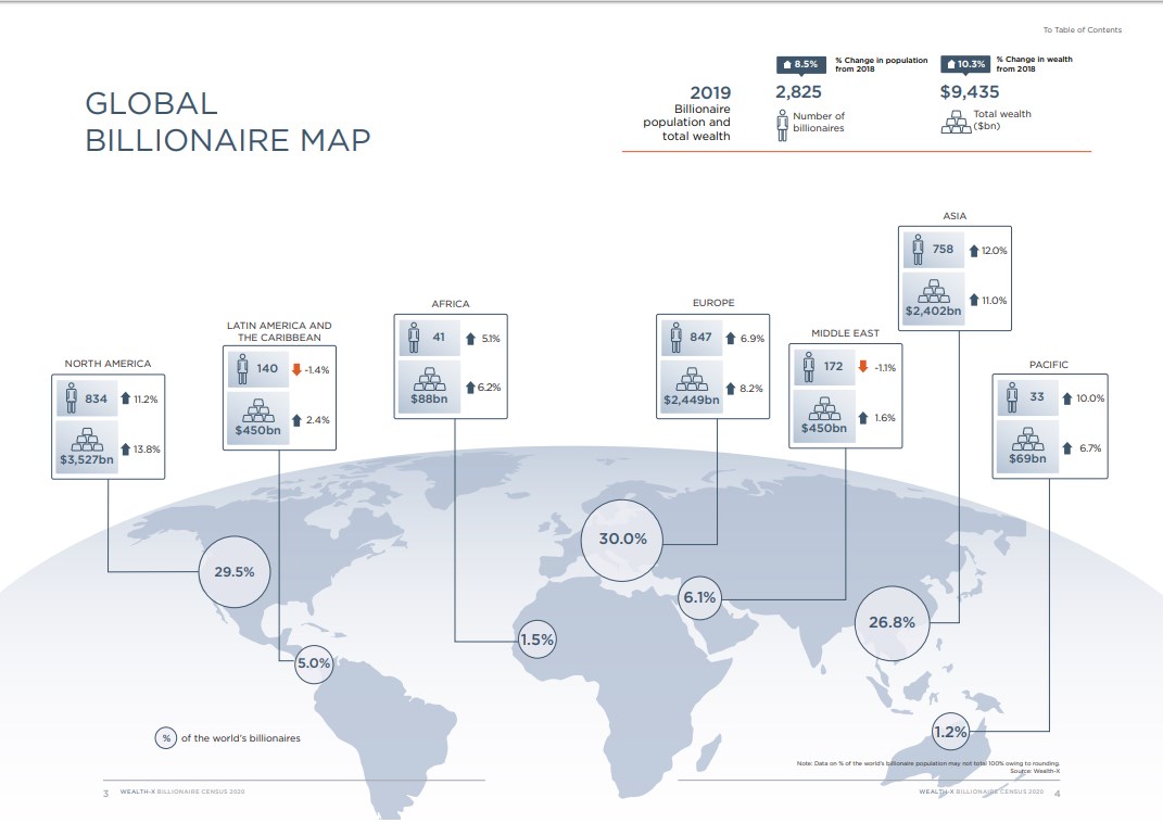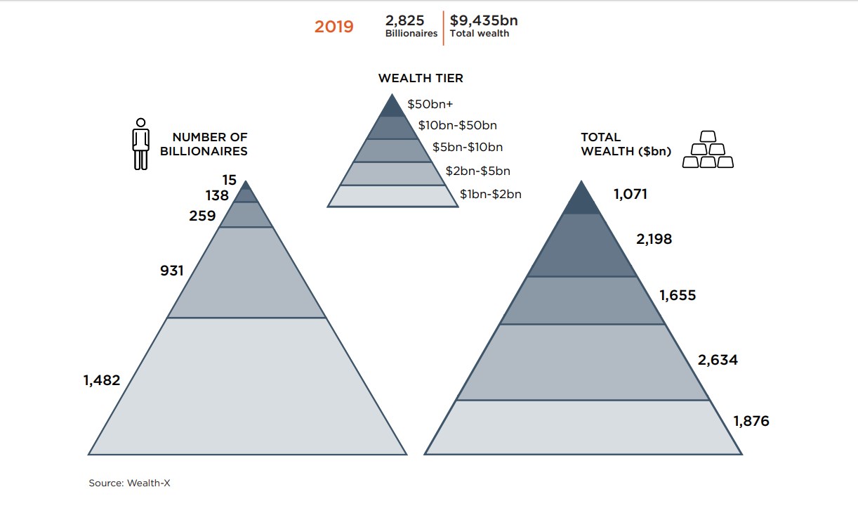 Согласно исследованию компании Wealth-X, в 2019 году в мире насчитывалось 2825 миллиардеров, что на 8,5%, больше, чем годом ранее (в 2018 году был спад в сравнении с 2017-м). Их суммарное состояние выросло за год на 10,3%, достигнув $9,4 трлн.