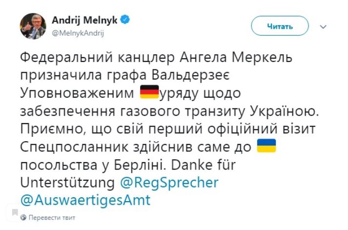 "Федеральный канцлер Ангела Меркель назначила графа Вальдерзее Уполномоченным немецкого правительства по обеспечению газового транзита с Украиной. Приятно, что свой первый официальный визит Спецпосланник совершил именно в украинское посольство в Берлине", - говорится в сообщении Мельника в Twitter.