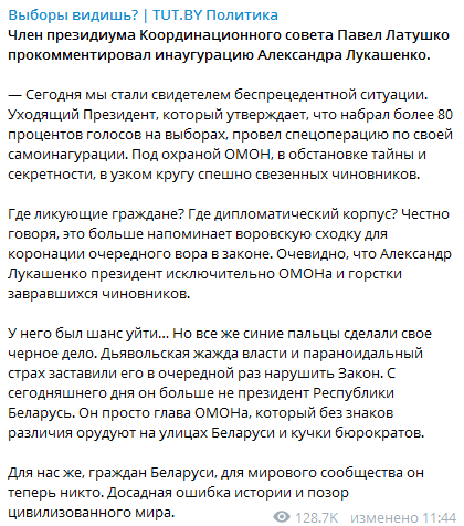 Член президиума Координационного совета Павел Латушко назвал инаугурацию Александра Лукашенко беспрецедентной. По словам оппозиционного политика, Лукашенко провел спецоперацию по своей самоинагурации. Под охраной ОМОН, в обстановке тайны и секретности, в узком кругу спешно свезенных чиновников без присутствия дипломатического корпуса и трансляции по телевидению. Павел Латушко считает, что последняя инаугурация Лукашенко "больше напоминает воровскую сходку для коронации очередного вора в законе. Очевидно, что Александр Лукашенко президент исключительно ОМОНа и горстки завравшихся чиновников".