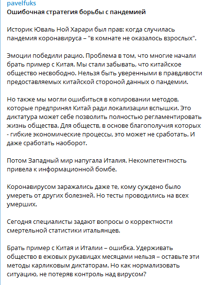 Фукс пишет, что зачастую эмоции победили рацио и многие стали брать пример с Китая. Однако люди забыли, что китайское общество несвободно и нельзя быть уверенными в правдивости данных о пандемии, предоставляемых китайской стороной.