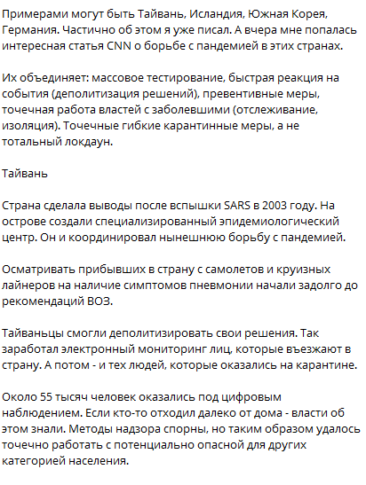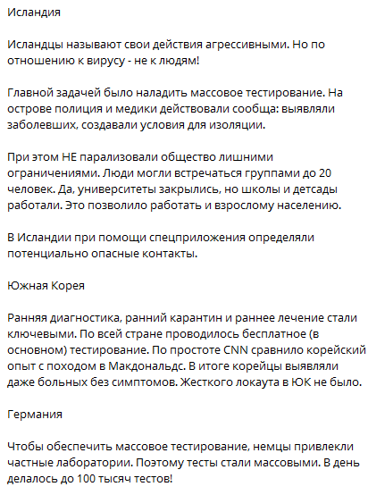 Некомпетентность Италии привела к информационной бомбе, пишет Фукс. Ведь там тесты на коронавирус проводили на тех, кто умер от других болезней. И если коронавирус подтверждался, то смерть все равно списывали на него. Брать пример с Китая и Италии – ошибка, отмечает Фукс. А вот брать пример следует с Тайваня, Исландии, Южной Кореи и Германии. Эти страны объединяет массовое тестирование, быстрая реакция на события (деполитизация решений), превентивные меры, точечная работа властей с заболевшими (отслеживание, изоляция). Точечные гибкие карантинные меры, а не тотальный локдаун.