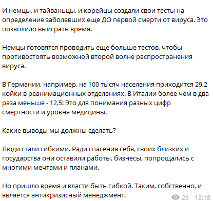 "Какие выводы мы должны сделать? Люди стали гибкими. Ради спасения себя, своих близких и государства они оставили работы, бизнесы, попрощались с многими мечтами и планами. Но пришло время и власти быть гибкой. Таким, собственно, и является антикризисный менеджмент", - отмечает Фукс.