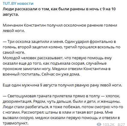 Телеграм-канал TUT.BY привел воспоминания двух пострадавших, которые были ранены в Минске. Оба мужчины получили серьезные раны в ночь с 9 на 10 августа.