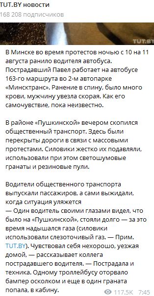 Также стало известно, что в Минске во время протестов ночью с 10 на 11 августа ранило водителя автобуса. Пострадавший Павел работает на автобусе 163-го маршрута во 2-м автопарке "Минсктранс". Ранение произошло в спину. Мужчину увезла скорая помощь с серьезной кровопотерей.