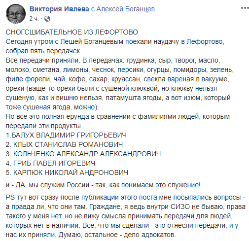 "Сразу после публикации этого поста мне посыпались вопросы – а правда, что они там. Граждане, я внутри СИЗО не бываю, права такого у меня нет, но не вижу смысла принимать передачи для людей, которых нет в наличии. Все, что мы сделали – это отнесли передачи, и у нас их приняли. Думаю, остальное – дело адвокатов", – добавила Ивлева, отвечая на комментарии читателей.