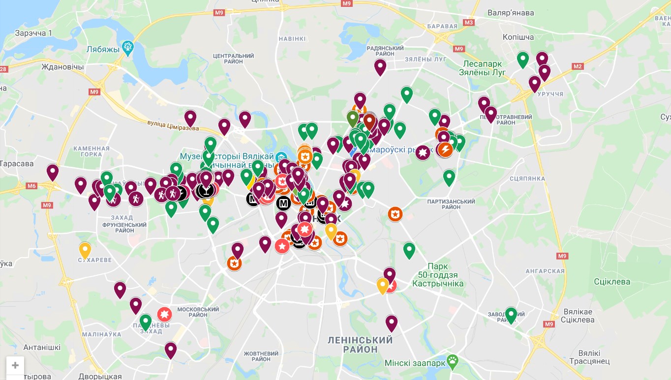 На карте обозначены пункты помощи протестующим, закрыты для входа станции метро. Зафиксировано и места перекрытия улиц, скопления отрядов ОМОНа. Все могут увидеть, где находятся транспортные средства и техника силовиков.