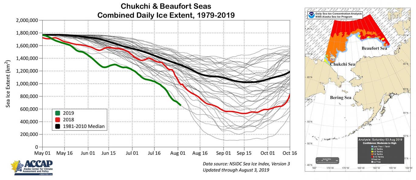 В публикации также отмечается, что таяние морского льда в Арктике не всегда является равномерным, однако таяние в Чукотском море, Бофорте на северо-востоке Аляски вызывает особое беспокойство.