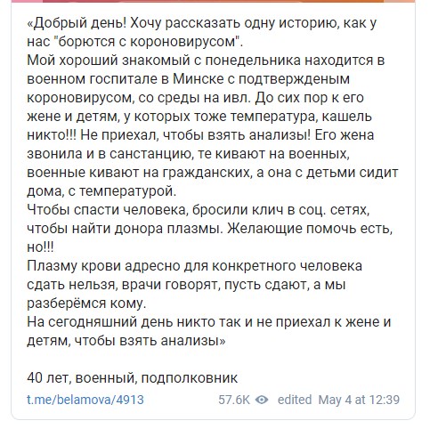 "Хочу рассказать одну историю, как у нас "борются с коронавирусом". Мой хороший знакомый с понедельника находится в военном госпитале в Минске с подтвержденным коронавирусом, со среды на искусственной вентиляции легких (ИВЛ). До сих пор к его жене и детям, у которых тоже температура, кашель никто!!! Не приехал, чтобы взять анализы! Его жена звонила и в санстанцию, те кивают на военных, военные кивают на гражданских, а она с детьми сидит дома, с температурой. Чтобы спасти человека, бросили клич в соц. сетях, чтобы найти донора плазмы. Желающие помочь есть, но!!! Плазму крови адресно для конкретного человека сдать нельзя, врачи говорят, пусть сдают, а мы разберёмся кому. На сегодняшний день никто так и не приехал к жене и детям, чтобы взять анализы", – написал пользователь соцсети.