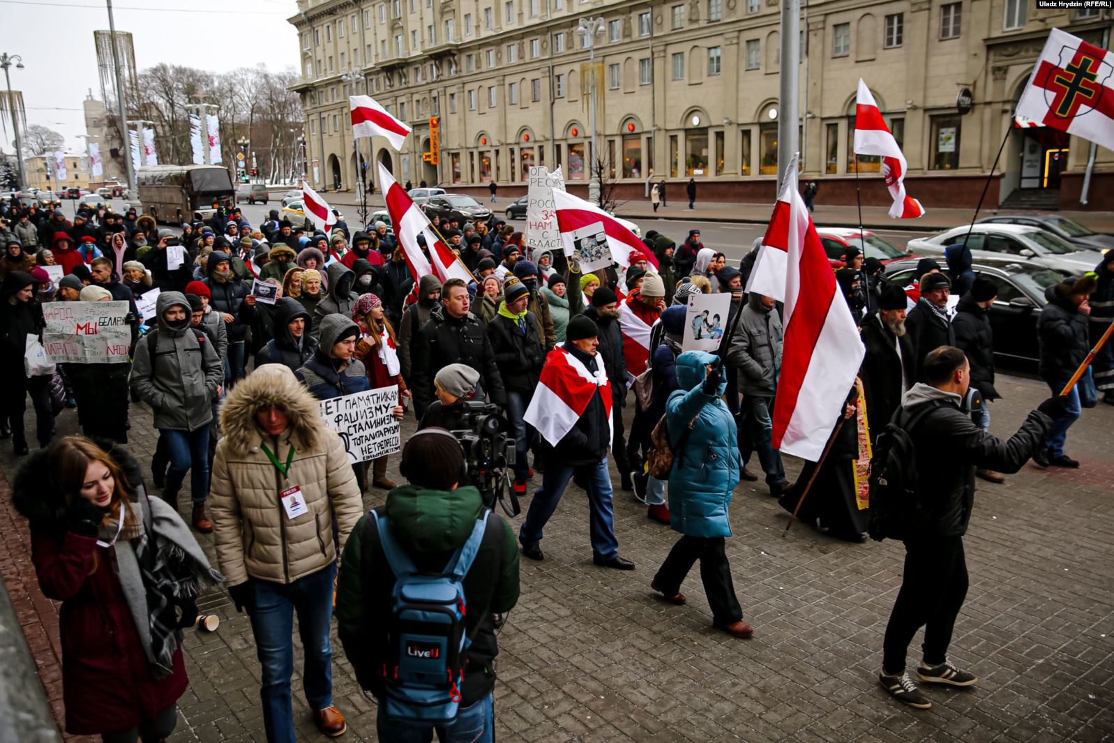 Протестующие держали портреты заключенных оппозиционеров и плакаты против интеграции Беларуси с Российской Федерацией.