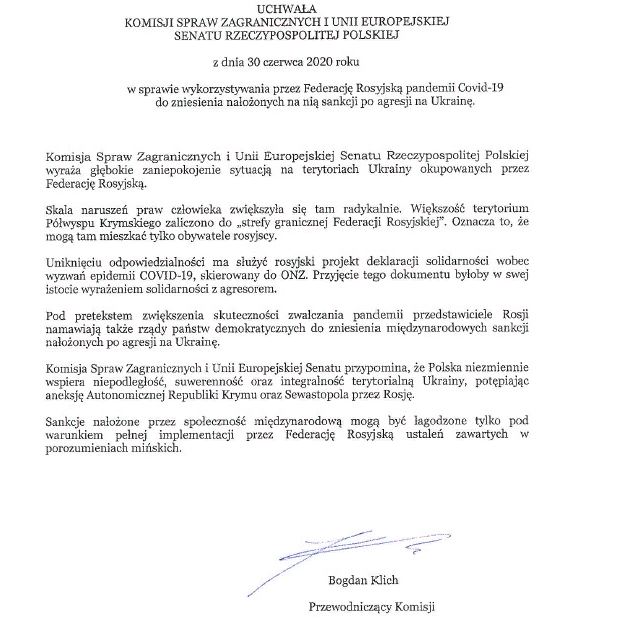 Об этом указывается в Постановлении Комиссии Сената РП по иностранным делам и ЕС. Документ был опубликован пресс-службой Украинского посольства в Польше в пятницу, 3 июля. Сам документ был провозглашен 30 июня 2020 года.