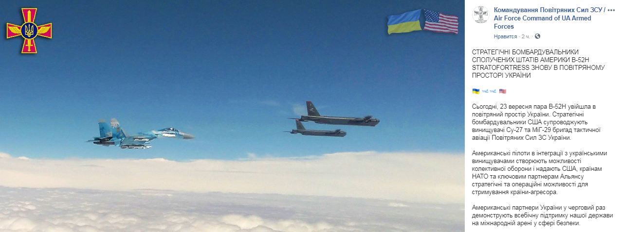 Сегодня, 23 сентября, два стратегических американских самолета-бомбардировщика В-52H вошли в воздушное пространство Украины. Самолеты сопровождали два украинских истребителя Су-27 и Миг-29.