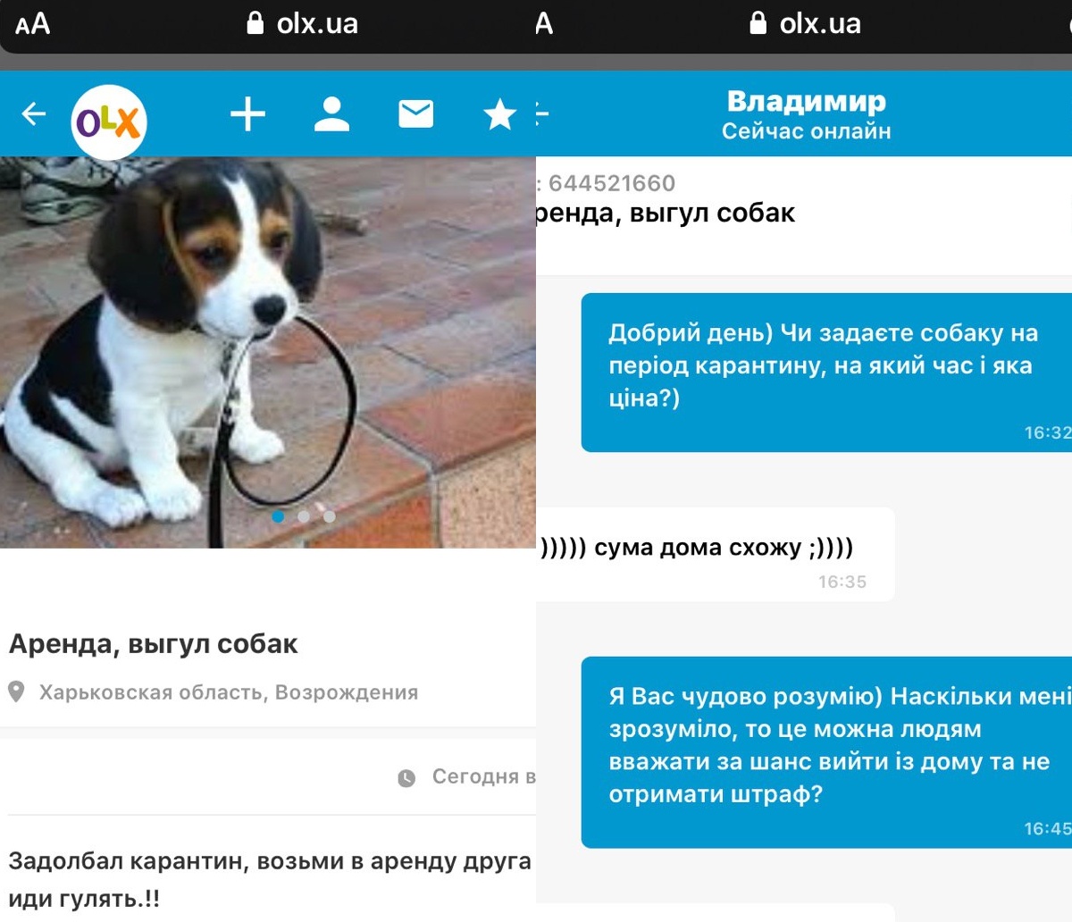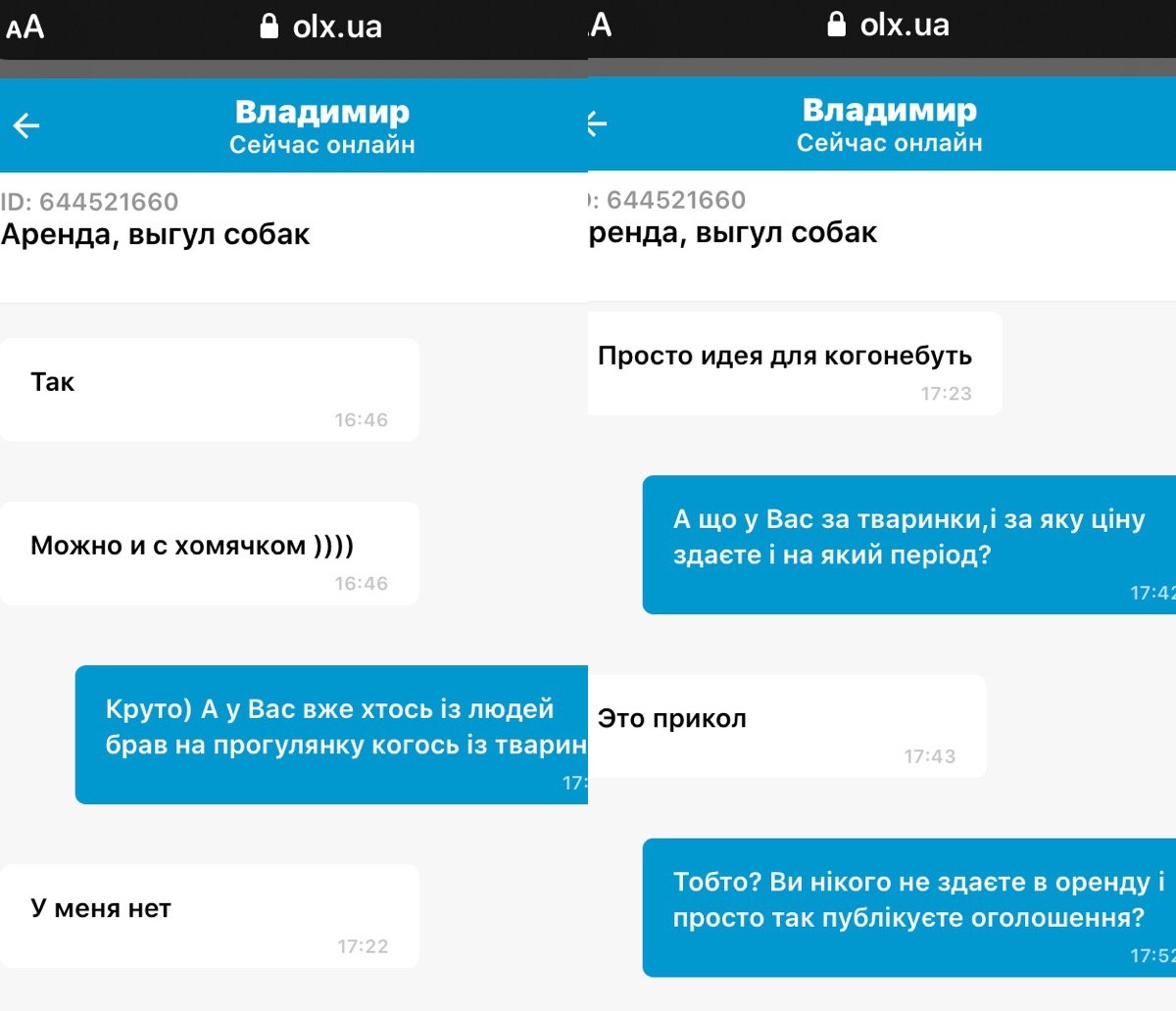 Но стоит остерегаться и "шутников", одним из которых оказался Владимир из Харьковской области. В общении он написал, что можно прогуляться с хомяком, а на вопрос, по какой цене и на какой период времени ответил, - "это шутка". Оказалось, что никаких животных у мужчины нет, а объявление опубликовал как "просто хорошую идею для любого".