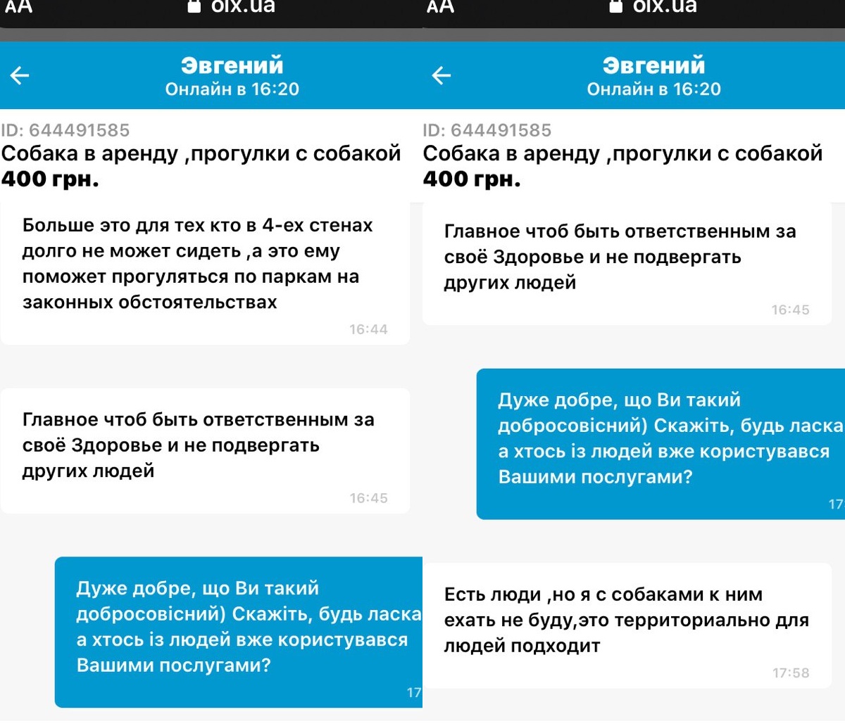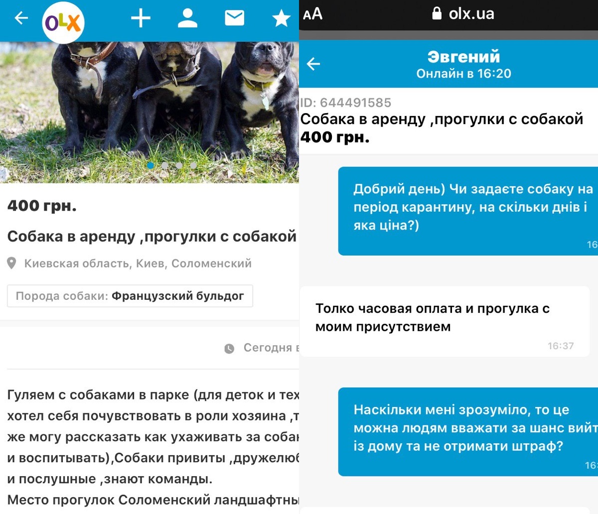 Журналистка ASPI news связалась с двумя хозяевами, которые предлагали "животные услуги". Человек из Киева по имени Евгений сдает в аренду французских бульдогов 400 грн/час и только с его личным присутствием. В описании на ОLХ Евгений указал, что собаки на фото со всеми прививками, выдрессированы и дружелюбны.