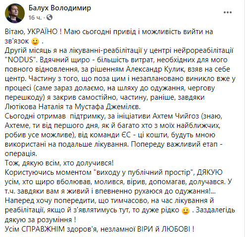 Бывший политзаключенный Кремля Владимир Балух, которого чуть не убили в начале сентября, впервые после нападения самостоятельно вышел на связь. Балух рассказал на своей странице в Facebook, что он уже второй месяц находится на лечении и реабилитации в частном центре нейрореабилитации. Финансово Балуху помогают друзья, среди которых Мустафа Джемилев и Ахтем Чийгоз. Балух рассказал, что впереди его ждет еще одна операция. Бывший политзаключенный Кремля поблагодарил всех, кто за него переживал и помогал.