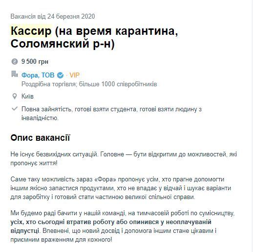 Требуются продавцы без опыта в крупные супермаркеты "Сильпо", "Ашан" и "Новус". Компании даже готовы нанимать студентов для работы за кассой на неполный рабочий день. Такая нехватка рук связана с тем, что большинство сотрудников попросту не могут доехать на свое рабочее место из-за перекрытого транспорта. "Фора" предложила пережить кризис с ними за 9 500 в месяц: "Мы рады видеть в нашем коллективе на временной вакансии тех, кто потерял работу и оказался в отпуске за свой счет".