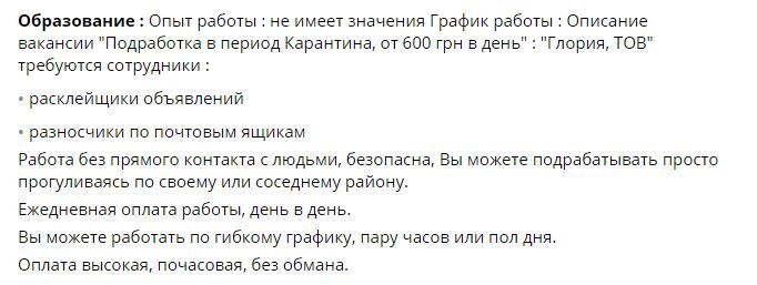 Для тех, кто боится личного контакта, появилась вакансия пеший курьер за 600 гривен в день. Все что необходимо – расклеивать объявления и разносить их по почтовым ящикам: "Подрабатывайте просто разгуливая по своему району".