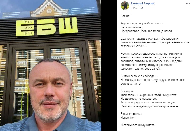 "Коронавирус перенёс на ногах. Без симптомов. Предполагаю, больше месяца назад. Два теста подряд в разных лабораториях показали наличие антител, приобретённых после встречи с Covid-19", - сообщил Черняк.