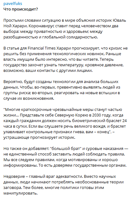 Бизнесмен и меценат Павел Фукс в своем Телеграм-канале привел важные тезисы из статьи историка Юваля Ной Харари про коронавирус.