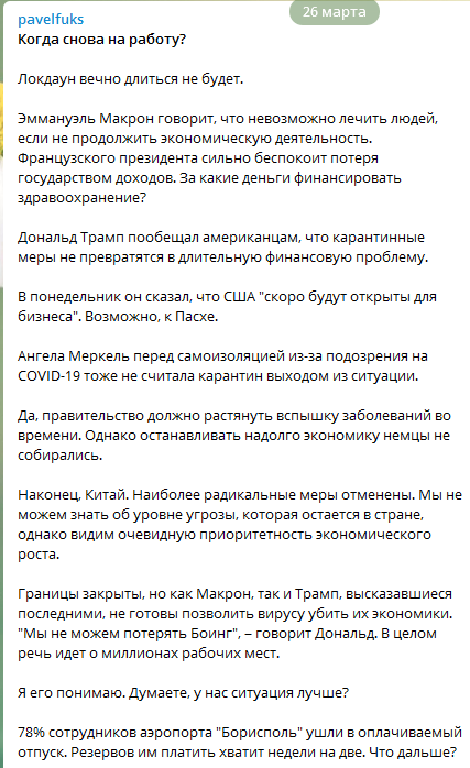 Известный украинский бизнесмен и меценат Павел Фукс в своем Телеграм-канале проанализировал ситуацию с карантином, на который из-за распространения коронавируса ушли многие страны мира.