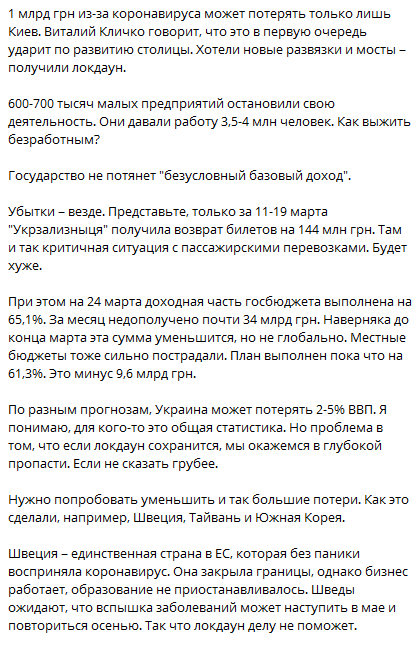Бизнесмен пишет, что на 24 марта доходная часть госбюджета выполнена на 65,1%, за месяц недополучено почти 34 млрд грн. По разным прогнозам, Украина может потерять 2-5% ВВП.
