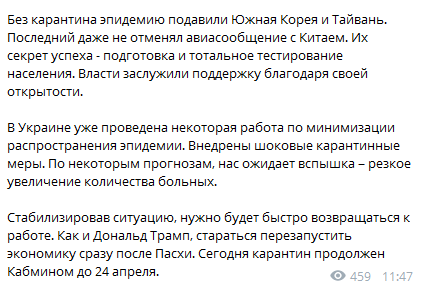 "В Украине уже проведена некоторая работа по минимизации распространения эпидемии. Внедрены шоковые карантинные меры. По некоторым прогнозам, нас ожидает вспышка – резкое увеличение количества больных. Стабилизировав ситуацию, нужно будет быстро возвращаться к работе. Как и Дональд Трамп, стараться перезапустить экономику сразу после Пасхи. Сегодня карантин продолжен Кабмином до 24 апреля", - резюмировал Павел Фукс.