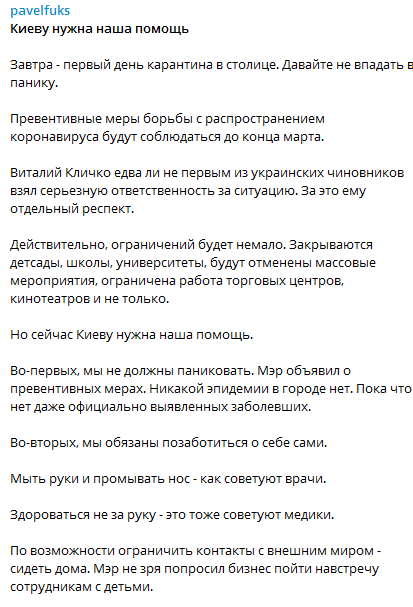 "Действительно, ограничений будет немало. Закрываются детсады, школы, университеты, будут отменены массовые мероприятия, ограничена работа торговых центров, кинотеатров и не только. Но сейчас Киеву нужна наша помощь. Во-первых, мы не должны паниковать. Мэр объявил о превентивных мерах. Никакой эпидемии в городе нет. Пока что нет даже официально выявленных заболевших. Во-вторых, мы обязаны позаботиться о себе сами", - написал Фукс.