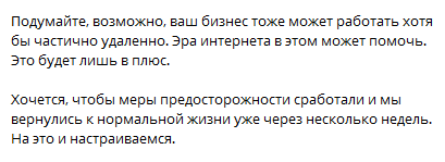 "Мэр не зря попросил бизнес пойти навстречу сотрудникам с детьми. Подумайте, возможно, ваш бизнес тоже может работать хотя бы частично удаленно. Эра интернета в этом может помочь. Это будет лишь в плюс. Хочется, чтобы меры предосторожности сработали и мы вернулись к нормальной жизни уже через несколько недель. На это и настраиваемся", - резюмировал Павел Фукс.