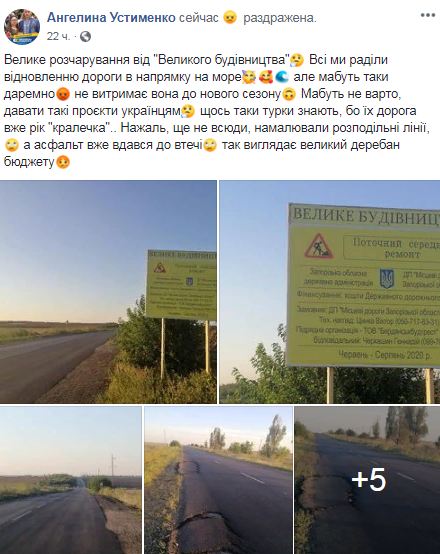 "Большое разочарование от "Большого строительства". Все мы радовались восстановлению дороги в направлении на море, но видимо таки зря. Не выдержит она до нового сезона", - сообщила Ангелина, проиллюстрировав свой пост фотографиями места разрушения дорожного полотна.