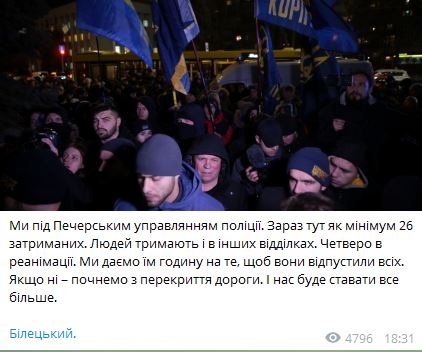 Сообщается, что киевская полиция отпустила 26 задержанных во время столкновений. Также сообщается, что возле Печерского райотдела полиции собрались представители "Национального корпуса" и других националистических сил с требованием отпустить задержанных.