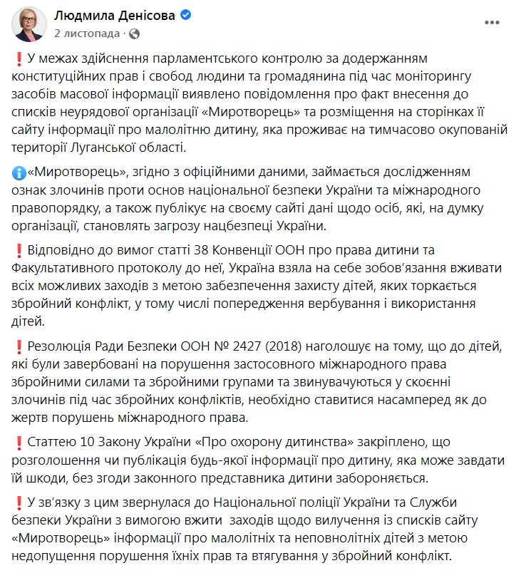 Причиной обращения Уполномоченной Верховной Рады по правам человека стала публикация на сайте личных данных 13-летней жительницы Луганска Фаины Савенковой. Денисова считает, что такая информация наносит ущерб детям и другим лицам, попавшим в соответствующую базу. Чиновница выступила за закрытие "Миротворца".