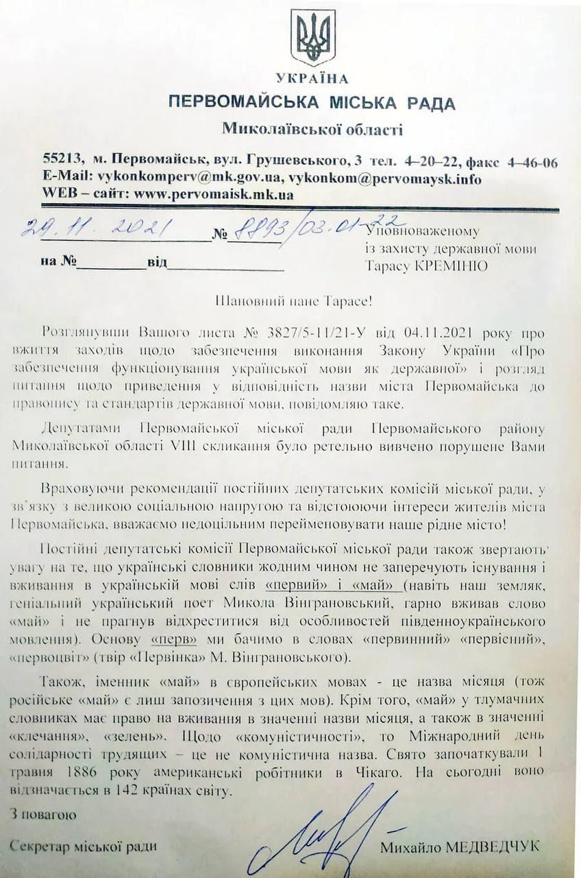 В Первомайске депутаты ответили на обращение языкового омбудсмена Тараса Кременя "О приведении названия города Первомайск в соответствие с правописанием и стандартами украинского языка". Ответ избранников опубликовал в своем Telegram-канале журналист Макс Назаров. В ответе говорится, что украинские словари не запрещают использование слов "первый" и "май".